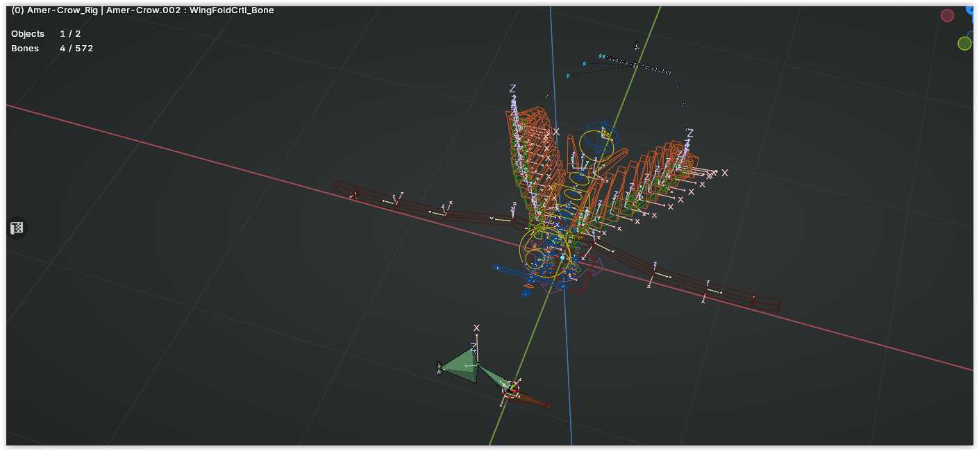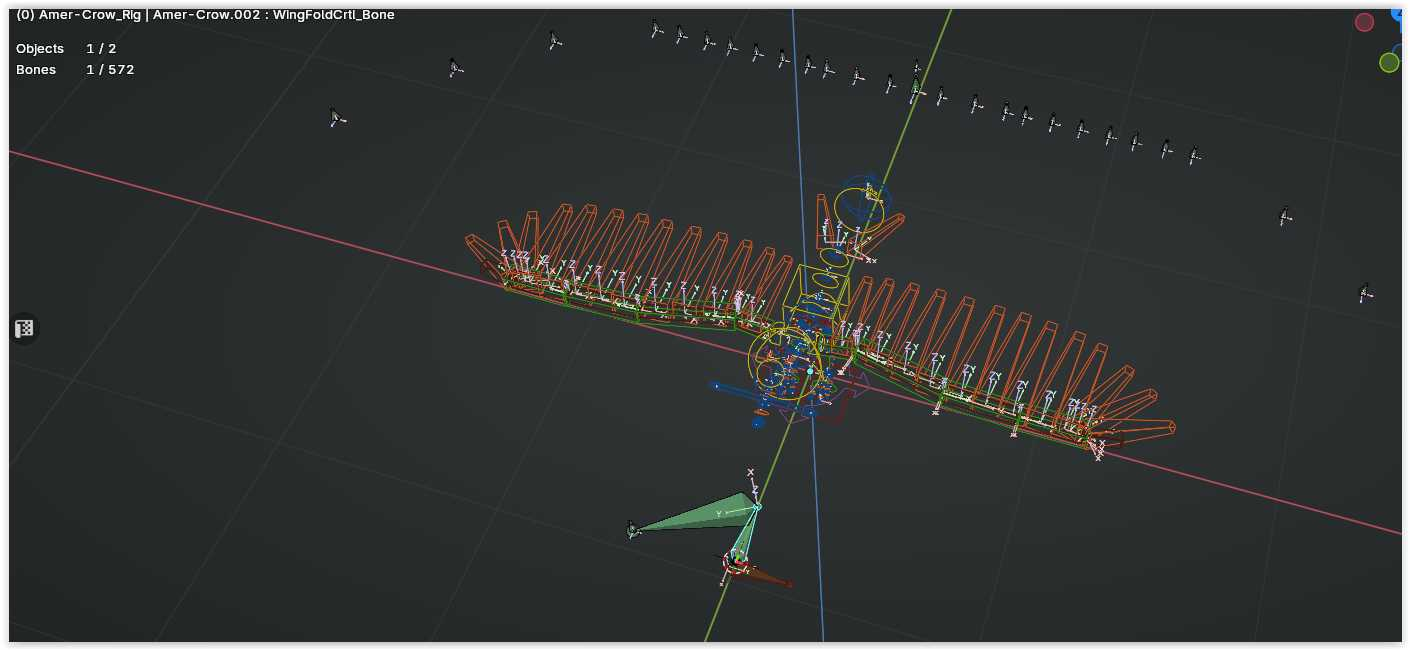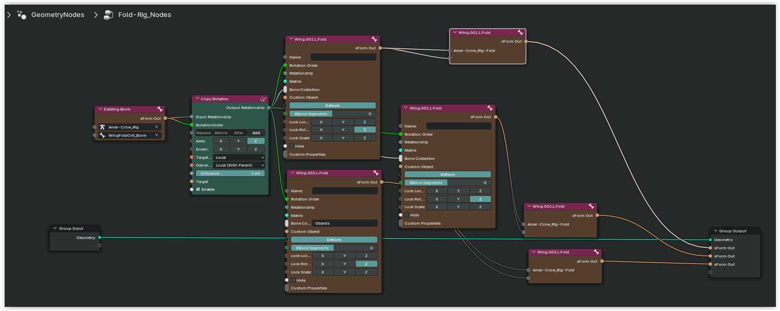 Currently attempting to use GeoNodes to help WingFold on Crow model, having failed with drivers, repeatedly. As WingFoldCrtl_Bone moves from Start-to-End position, the wings fold back. Wing.L rotates correctly, simple Copy Rotation Z. I did have each of the remaining bones moving correctly(?_sort-of), but I couldn't get both a Z copy to Z, with a Z copy to X to best place the wing at the end of the adjustment full fold. I was using 'Easy Driver' which helped but tweaking the results required adjusting 'values' which isn't supported, thus my attempts with Geo Nodes. I have not seen a demo of adding Geo Nodes to an existing Rig, particularly since Geo Nodes is required to be set before Armature, and it is a function of the Object, not the Rig itself? I am a 'new' subscriber,' and bought 'coins,' not sure where to Post this.